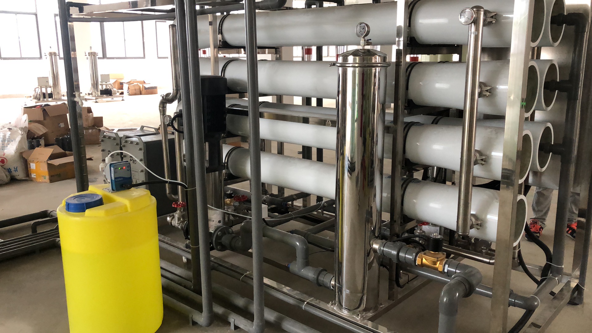 +Bộ lọc tinh (phin lọc an toàn): chứa các lõi lọc PP 1- 5 micron loại bỏ các tạp chất, cặn lơ lửng trước khi cấp nước vào hệ thống RO, có công dụng kéo dài tuổi thọ của màng RO công nghiệp.